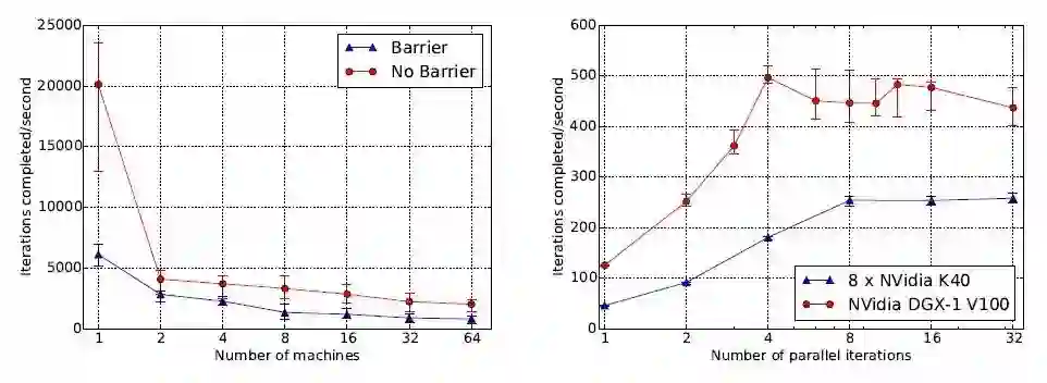 图 8 和图 9 是对分布式迭代计算性能和扩展能力的基准测试情况。基准测试采用了一个 while_loop,循环体分区运行在一个 GPU 集群上。如图 7 所示,测试中采用的一种数据同步情况是设备间不做协调,另一种是每次迭代结束后所有设备等待协调(类似于 AllReduce)。图 8 左图显示了机器数从 1 增加到 64,每秒实现迭代次数的变化情况。图 8 右图表明,并行运行迭代对于实现 GPU 间的并行十分关键。图 9 给出了 GPU 数量对于处理性能(表示为每秒迭代次数)的影响情况。