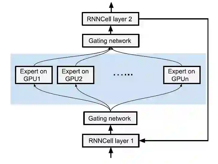 图 1 给出的是 Google 自然语言处理所用模型的一个简化架构,其中包括了两个 RNN 层,以及一个提供 RNN 层间动态学习连接的 MoE(混合专家,Mixture of Experts)层。架构中的各个组件可运行在不同的设备上,其中使用了基本的动态控制流。计算的不同实现策略,对模型的性能具有很大的影响。例如,实现高性能 RNN 的挑战在于如何权衡内存的使用和计算时间。如果使用多 GPU 的分布式计算,在 GPU 间交换张量可降低对内存的使用,这为权衡添加了新的维度。