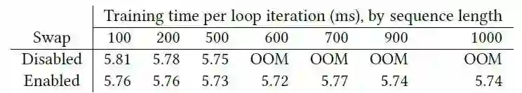 实验表明,如果不使用内存交换机制,那么系统在处理序列长度 500 时就无内存可用。但在启用了内存交换后,同一系统可以处理序列长度 1000,并且开销很小。可用的内存情况,是限制系统处理最大序列长度能力的首要因素。