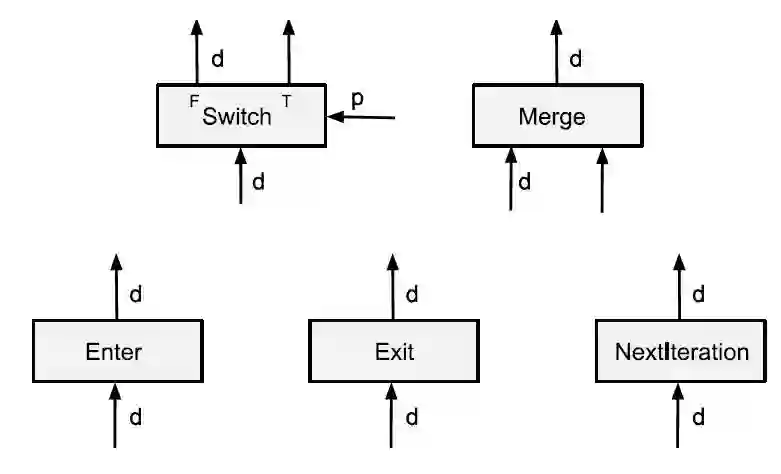 在模型的设计上,论文考虑提供一小组灵活的、有表现力的原语,作为计算数据流模型中高层控制流构件的编译目标。模型给出了五个控制流原语,分别是Switch、Merge、Enter、NextIteration和Exit,如图 2 所示。高层控制流构件可编译为由上述控制流原语组成的数据流图,进而实现数据流图的细粒度分区。