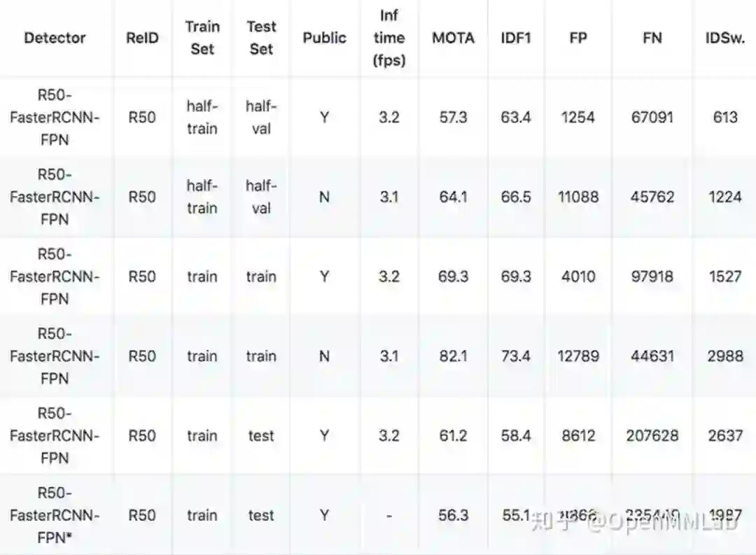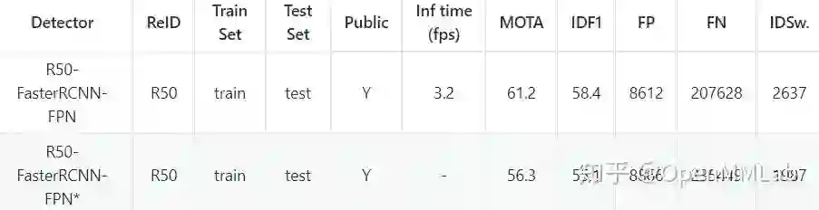 对多目标跟踪算法 Tracktor 的实现结果(第一行)相比于官方实现(第二行),在 MOT17 数据集上 MOTA 超出 4.9 个点,IDF1 超出 3.3 个点。