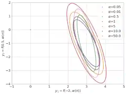 具有不同 α 因子的 NTK 线性模型的动态学习过程, NTK 可视化为椭圆形(来源:Rajat的博客)。