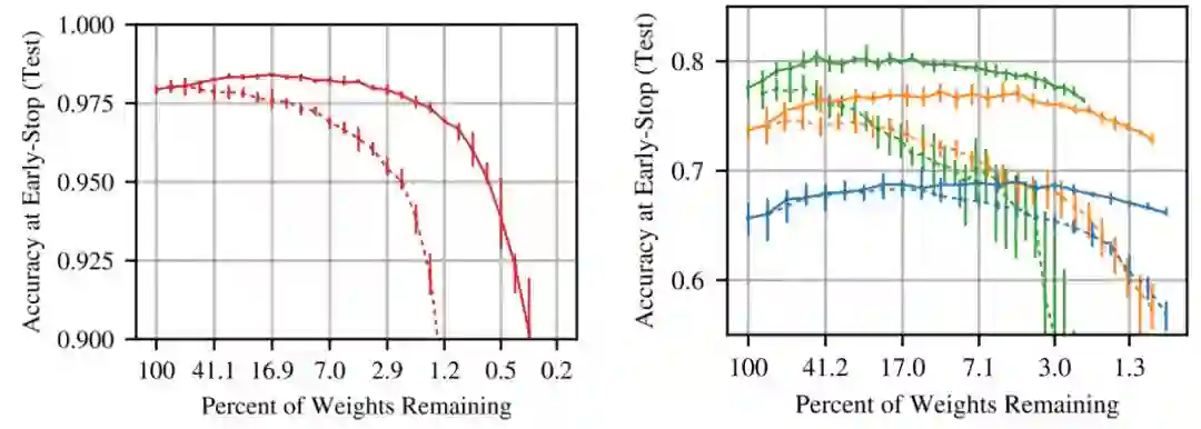 在不同的剪枝率下测试中奖彩票子网络(实线)与随机采样子网(虚线)的准确性(Frankle&Carbin,2019)。