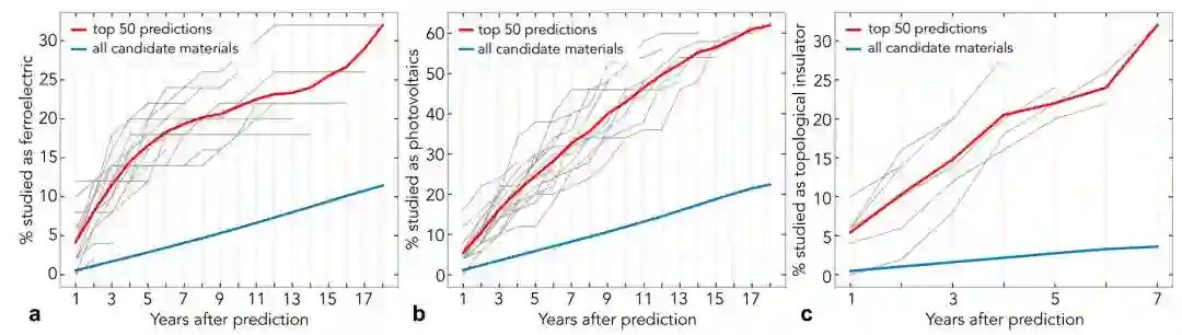 使用在不同时间段的摘要上训练得到的词嵌入预测将在未来的摘要中研究哪些材料作为铁电材料(a),光伏材料(b)和拓扑绝缘体(c ),与所有候选材料相比,更有可能对前50个预测材料进行研究(Tshitoyan等人,2019)。