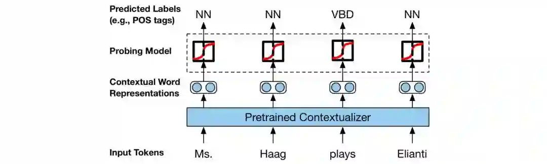 在我的印象中,过去一年首次出现很多致力于分析单个模型 BERT 的论文的现象(此类论文被称为 BERTology)。在这种情况下,旨在了解模型是否通过预测某些属性来捕获形态、语法等的探针,已成为一种常用工具(参见下图)。