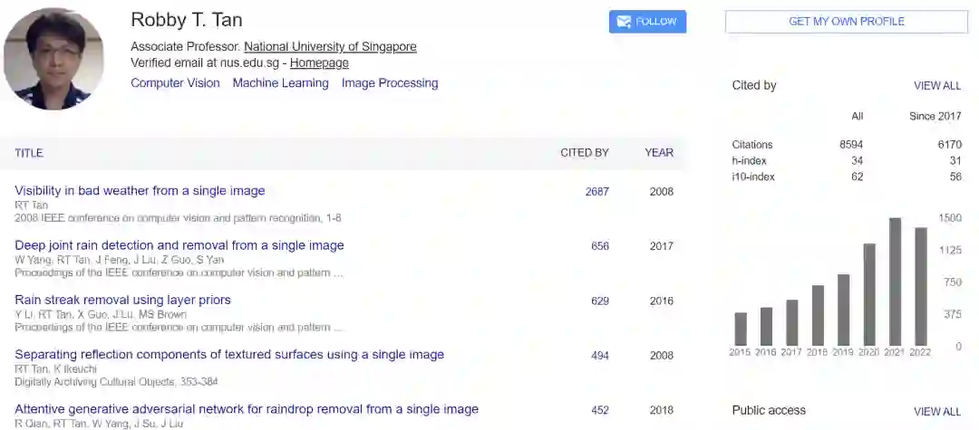 Prof. Robby T. Tan 是新加坡国立大学(NUS)电子和计算机工程系(ECE)的一名副教授(Associate Professor)。他还在 Yale-NUS College, NUS 计算机学院(School of Computing)和数据科学研究所(Institute of Data Science)担任客座教授。