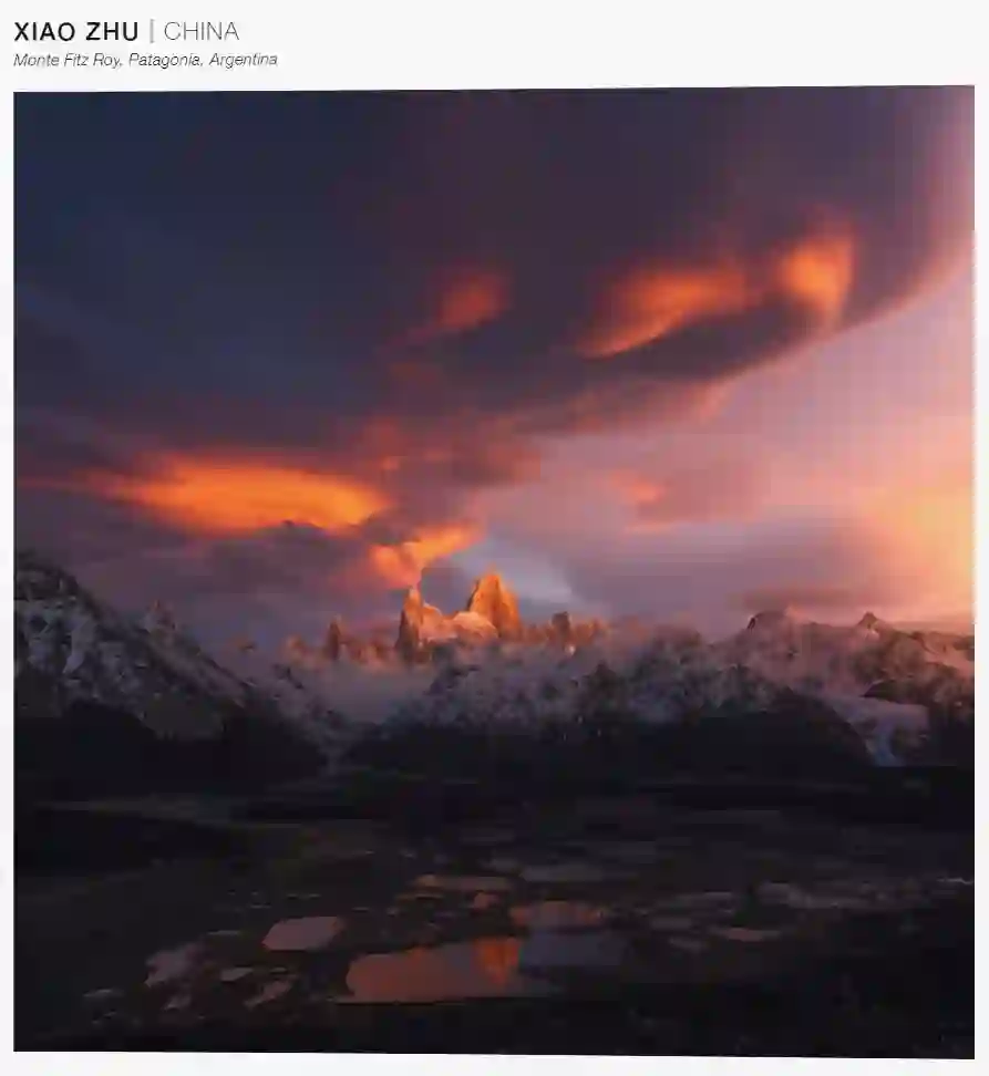 值得庆祝的是来自中国的摄影师Zhu Xiao(枪炮玫瑰),凭借其捕捉到的异常壮丽的阿根廷Fitz Roy峰日出,获得了日出日落组的第一名。