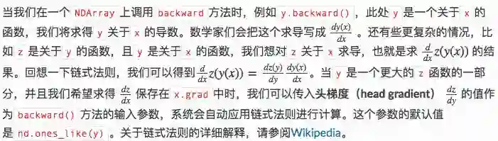 接下来我们可以通过z.backward()来进行求导。如果z不是一个标量,那么z.backward()等价于nd.sum(z).backward().
