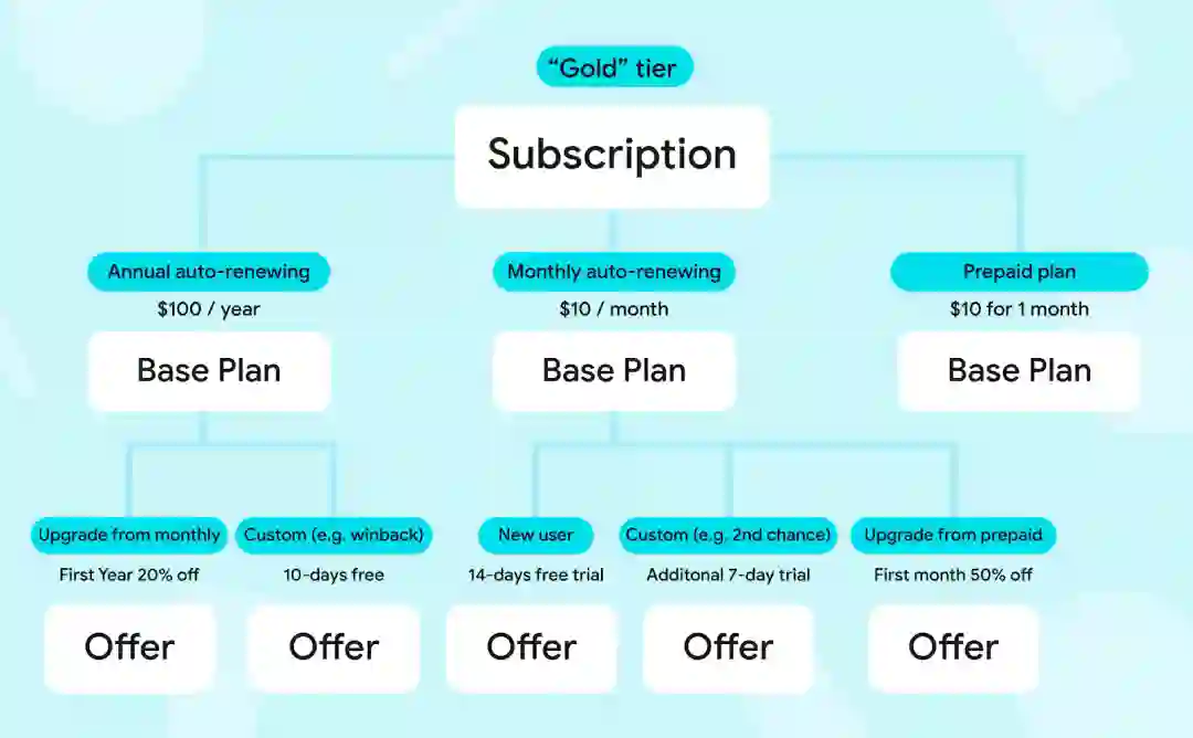 您可能已经注意到了 Play 管理中心的变化,因为我们将现有的订阅 SKU 重新划分为订阅、基本计划和优惠三个部分。新的订阅配置使用起来和以前一样,您无需立即更新自己的应用或后端服务。