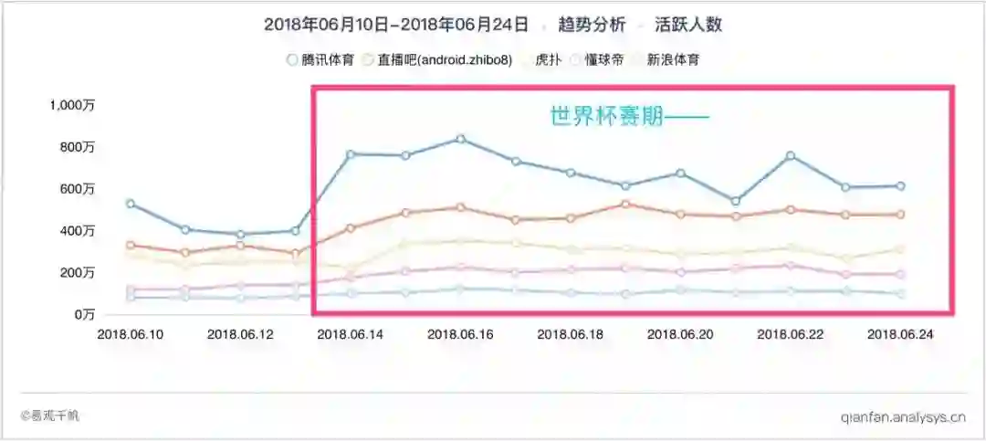 进入世界杯赛期以后,通过在内容运营方面发力,腾讯体育、直播吧、虎扑、懂球帝、新浪体育等APP基于赛前日活规模,都进入明显的日活增长期。