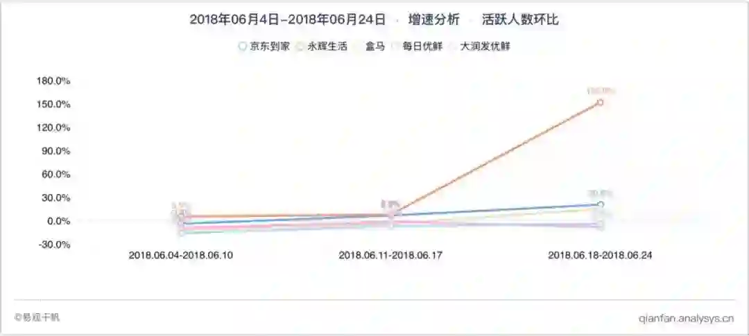 世界杯期间,生鲜电商加大营销优惠力度,在延长夜间配送时间和加快配送速度,充分挖掘用户服务体验满意度,及时满足你的饕餮食欲。世界杯赛期至今,生鲜电商应用日活规模相较于赛前呈现较大增幅。其中,每日优鲜、盒马、大润发优鲜、永辉生活(生鲜品类:超级物种),在赛期整体日活规模上涨的同时也表现出波动性。京东到家配合主平台京东,围绕618暨端午节大促在6月18日当天形成明显的日活高峰,日活规模达到47.7万。