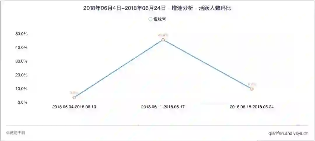 在周活跃规模增速方面, 世界杯赛事第一周,懂球帝增速一骑绝尘,环比增长45.6%,第二周增速开始减缓,但也达到了9.7%。