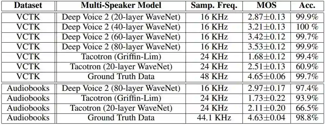 表 2:所有多说话人模型之间的 MOS 和分类准确度比较。为了得到 MOS,我们使用了 crowdMOS 工具包,细节如表 1 所示。我们还给出了在样本上的说话人鉴别模型(详情参见附录 D)的分类准确度,表明其合成的声音的区分度和真实音频一样。