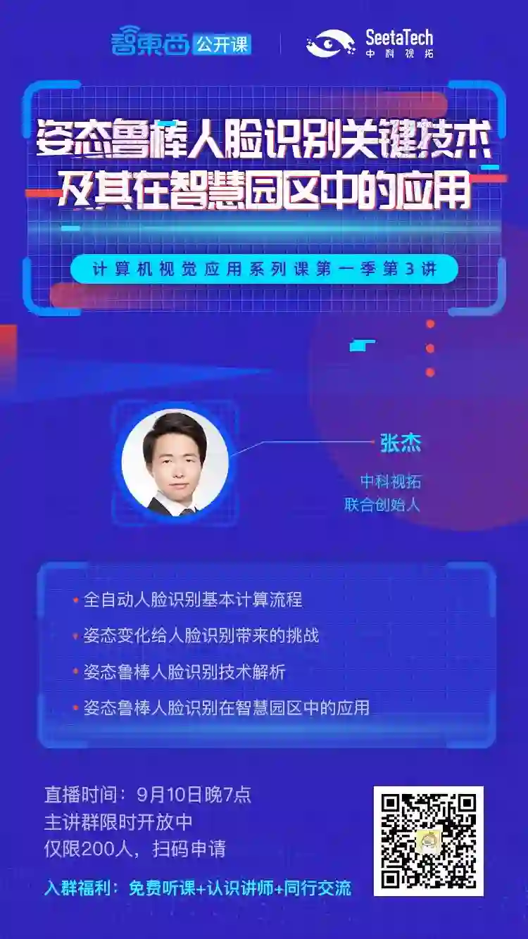 下周二晚七点,智东西公开课策划推出的计算机视觉应用系列课第三讲继续开讲。中科视拓联合创始人张杰将主讲,主题为《姿态鲁棒人脸识别关键技术及其在智慧园区中的应用》。