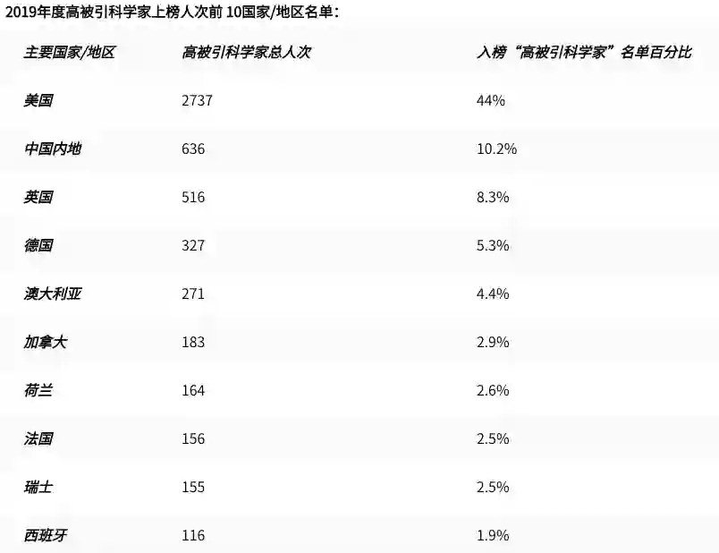 2019年度高被引科学家上榜人次前 10国家/地区名单(来自科睿唯安官网)