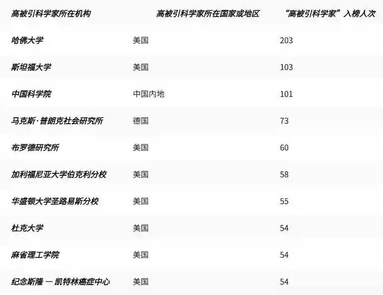 哈佛是全球高被引科学家人数最多的机构,中科院领跑内地