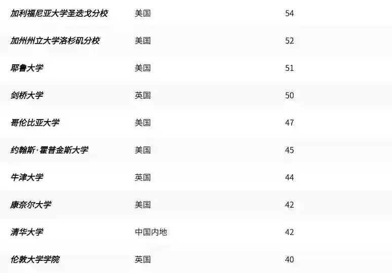 美国加州也是顶尖人才的聚集地,斯坦福大学有103人次上榜,此外加利福尼亚大学伯克利分校、圣迭戈分校和洛杉矶分校都分别有超过50人次上榜。