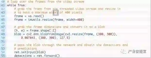 第 48 行和 49 行从这一帧中生成 blob。要了解更多 blob,以及如何使用 cv2.dnn.blobFromImage 函数构建 blob,请在以前的博文中查看所有细节(https://www.pyimagesearch.com/2017/11/06/deep-learning-opencvs-blobfromimage-works/)。
