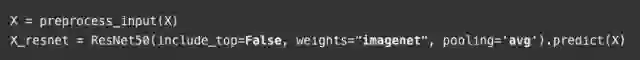 首先,我们将用Resnet50模型(参见论文和keras文件)进行特征提取。注意,我们所使用的是大小为244X244像素的图像。为了生成整个数据集的向量representations,需要添加以下两行代码: