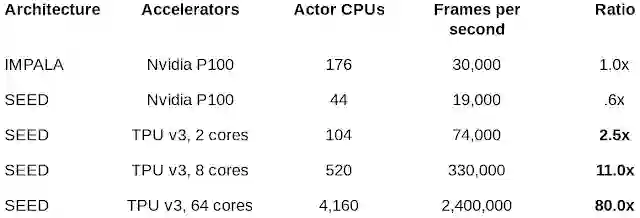 在 DeepMind Lab 上对比 IMPALA 和 SEED RL 各种配置的每秒帧数:SEED RL 使用 4,160 个 CPU 达到每秒 240 万帧的计算速度。假定速度相同,IMPALA 将需要 14,000 个 CPU