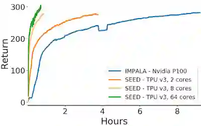 在“SEED RL:具有加速集中推理功能的高效可扩展的 Deep-RL” (SEED RL: Scalable and Efficient Deep-RL with Accelerated Central Inference) 一文中,我们介绍了可扩展到数千台机器的 RL 智能体,RL 智能体能够以每秒数百万帧的速度进行训练,同时显著提高计算效率。这一成果通过一种新颖的基础架构实现的,集中模型推理并引入快速通信层来大规模利用加速器(GPU 或 TPU)。我们以广泛使用的 RL 基准(例如 Google Research Football、Arcade Learning Environment 和 DeepMind Lab)来验证 SEED RL 的性能,并表明了可以通过使用更大的模型来提高数据效率。