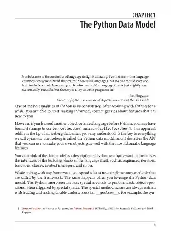 第一部分只有单独的一章,讲解的是 Python 的数据模型(datamodel),以及如何为了保证行为一致性而使用特殊方法(比如__repr__),毕竟 Python 的一致性是出了名的。其实整本书几乎都是在讲解 Python 的数据模型,第 1 章算是一个概览。