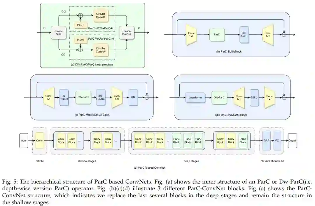 对于ParC ConvNets,专注于为ConvNet提供全局感受野。用ParC操作替换标准卷积(如图5(a)所示),作者构建了不同的基于ParC的块。以往的混合结构工作得出了类似的结论:早期使用局部模块,深层使用全局提取模块的模型性能最佳。由于ParC拥有一个全局感受野,按照这个规则将基于ParC的块插入ConvNets(如图5(e)所示)。