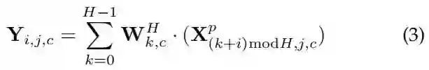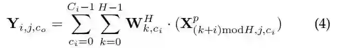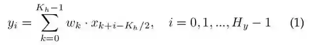 为了描述在 形状的4D输入张量上以水平维进行的一维深度卷积 (称为 Conv1dH), 可以首先关注一个特定的通道。将输出表示为 , 输入为 , 卷积权重为 。然后, 带零填充的 Pytorch 型卷积 (即 F.conv1d)可以表示为: