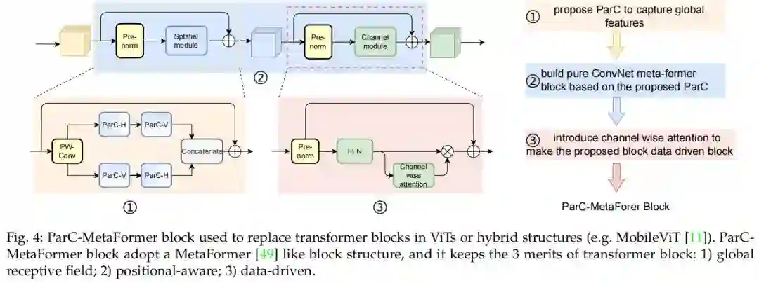 如图4和图5所示,ConvNets和ViTs的外层结构差异较大。vit通常采用 meta-former block作为基本架构。为了在ViTs上应用ParC运算符,作者设计了ParC-MetaFormer block,并使用它来替换ViTs中的transformer blocks。