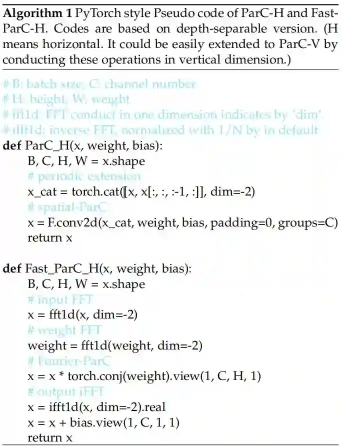 借助于快速傅里叶变换(FFT)设计了Fast ParC。众所周知,FFT可以简化线性卷积运算。但根据卷积定理,对于离散信号,傅里叶域的点积更接近于空间域的Circular Convolution。这正是ParC和普通卷积的区别之一。