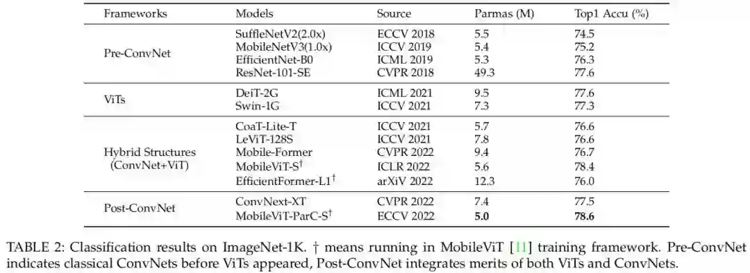 为了验证ParC作为即插即用元运算符的有效性,基于第3.1节中提出的操作构建了一系列基于ParC的模型。这里,基线模型包括ViT和ConvNets。具体而言,对于ViT,MobileViT被选为基线,因为它在最近提出的轻型混合结构中实现了最佳参数/精度权衡。