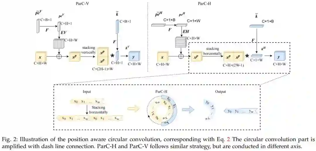 本文结合Transformer和ConvNets的优点,构造了一种新的即插即用运算符ParC。ParC具有全局接受域,因为使用全局核(Kh=H或Kw=W)并采用循环卷积方案。然后,在卷积之前采用一个明确的可学习位置嵌入,以保持模型位置敏感。