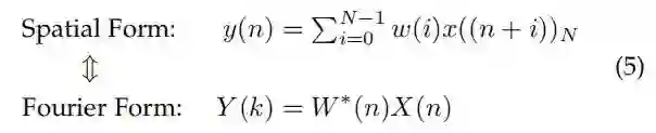 此外, ParC 的另外两个特征, global kernel 和right padding, 也很好地符合傅里叶域卷积的默认模式。这一有趣的事实能够为 ParC 开发一个非常整洁、漂亮的频域实现。将 、 和 定义为时域中的输入、权重和输出序列, 和 定义为傅里叶域中的序列, 可以得到以下等价关系: