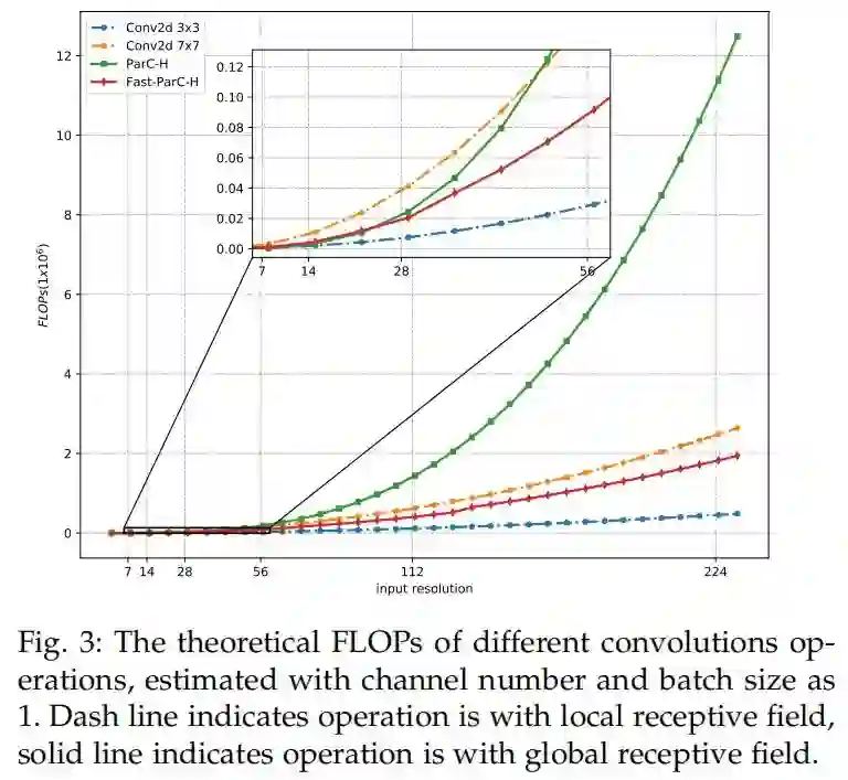 如图3所示,当特征分辨率较小时(如7×7),应用ParC可以有效地提取全局特征并降低计算复杂度。但随着输入分辨率的提高,ParC的复杂度迅速超过7×7卷积。为了克服这个问题提出了一个名为Fast ParC的ParC加速版本。当特征分辨率较大时(例如,56×56),Fast ParC比ParC效率更高。事实上,Fast ParC虽然具有全局提取能力,但在较宽的分辨率区间内,其效率甚至比7×7卷积更高。