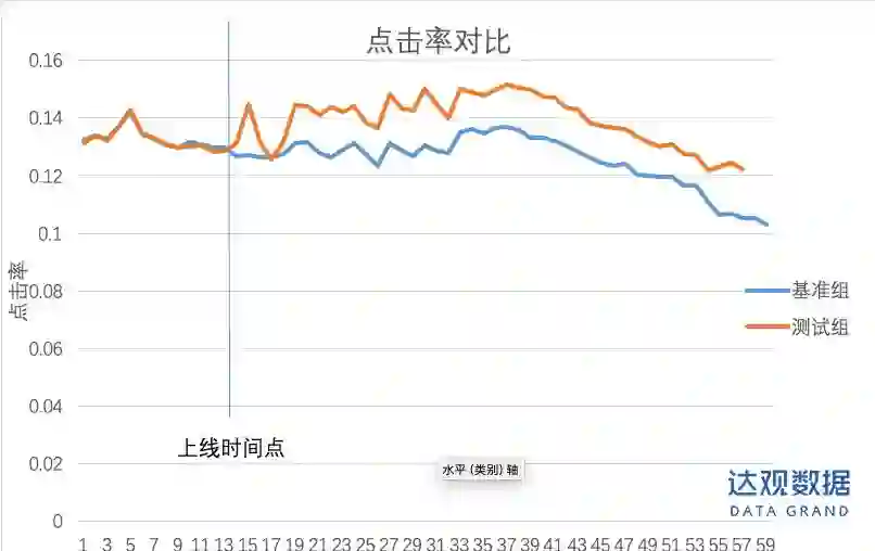 我们在测试组上线ltr逻辑后,在点击率指标上相比原算法取得了明显的提升。如下图所示: