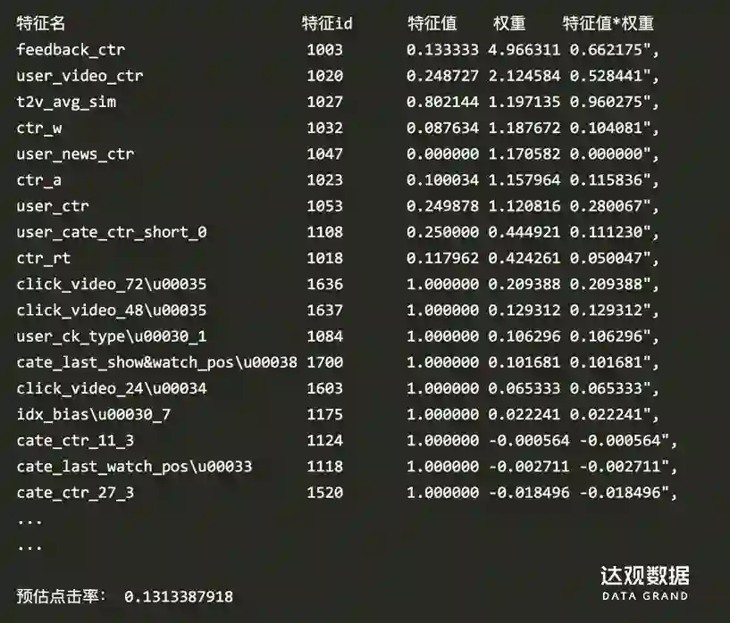 lr模型可以方便debug每个样本的各个特征和权重,权重高的特征显然更加重要。如果你觉得重要的特征权重过低了或者不重要的特征权重过高了,也许就要思考为什么了。以下是一个样本的debug信息。