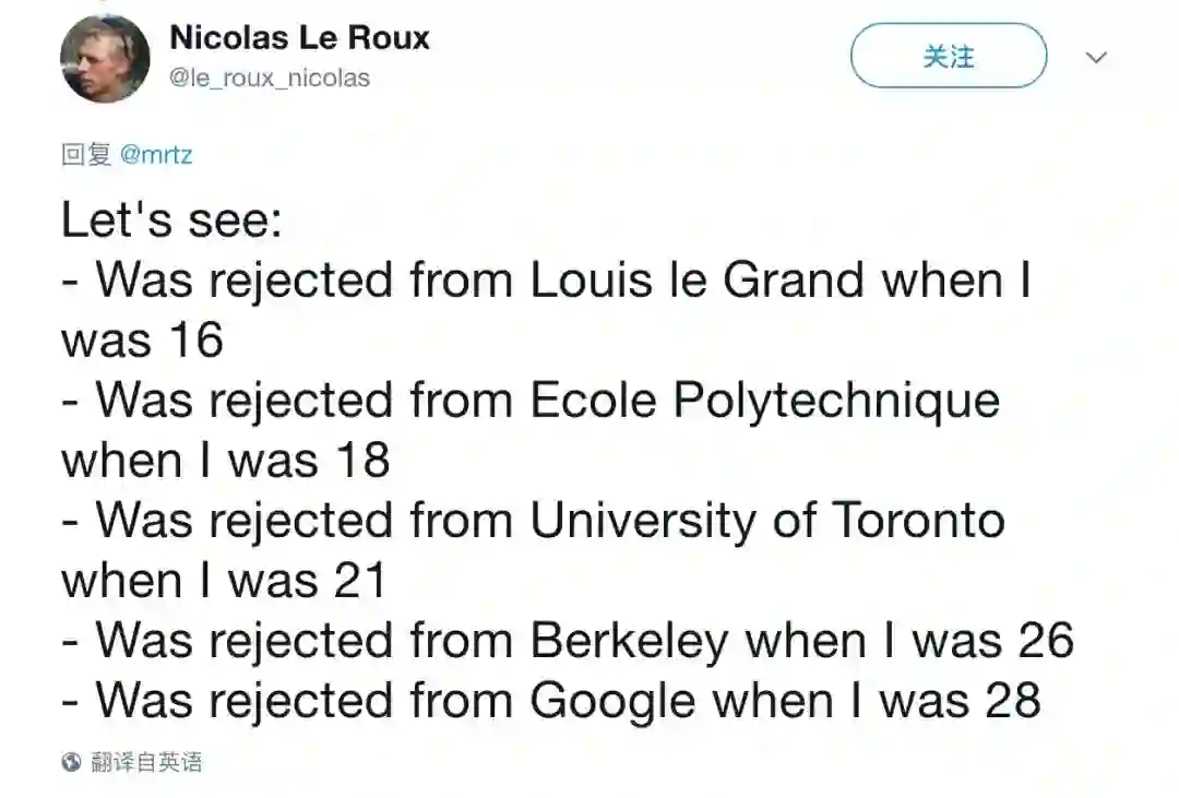 发出感慨的还有更多人。比方Nicolas Le Roux说,他16岁被高中拒掉、18岁被巴黎综合理工大学拒掉、21岁被多伦多大学拒掉、26岁被伯克利拒掉、28岁被谷歌拒掉……现在他是谷歌大脑的机器学习研究员,Goodfellow的同事。