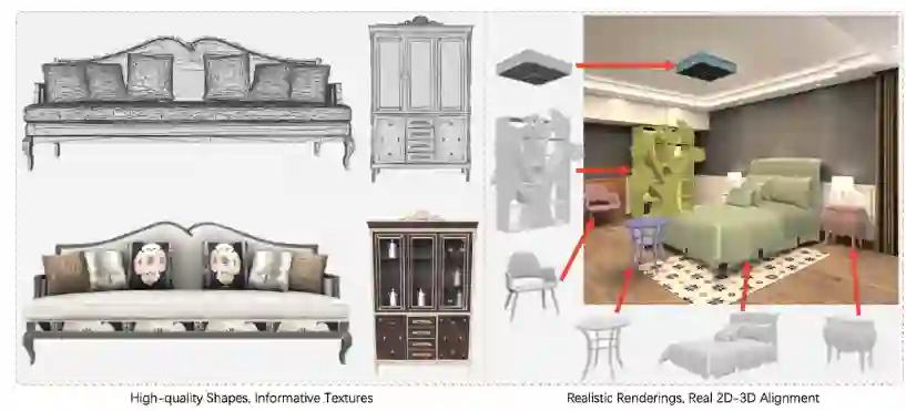 其初版包含 20,000+ 高清室内场景专业设计渲染图,与 10,000+ 精细的高质量 3D 家具模型及对应的高清且饱含信息的纹理,数据积累沉淀于阿里巴巴官方家装家居设计平台-躺平设计家。目前提供家具实例分割标注,完全真实的 2D 到 3D 的对准标注,以及专业的细粒度家具属性标注。