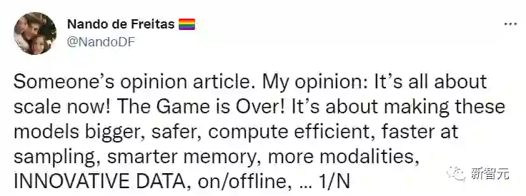 DeepMind的研究部主管Nando de Freitas当时还发了一个推特表示,只要不断提升规模(scale)就能把AI给通关了!