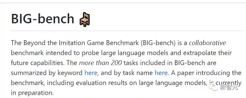 BIG-bench是一个众包的基准数据集,旨在探索大型语言模型并推断其未来的能力,其中包含200多个任务。