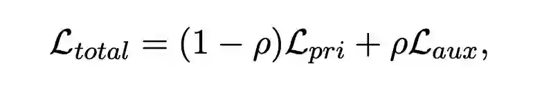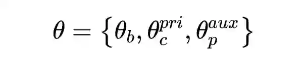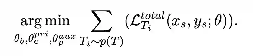 本文额外添加 MTP 辅助任务来获取到更丰富的 task distribution,通过多任务学习限制主任务(分类任务)的训练以提升基学习器的鲁棒性。这种限制避免了基学习器针对某一任务获取过多额外的特征来缓解过拟合。形式化来讲,总的损失函数如下: