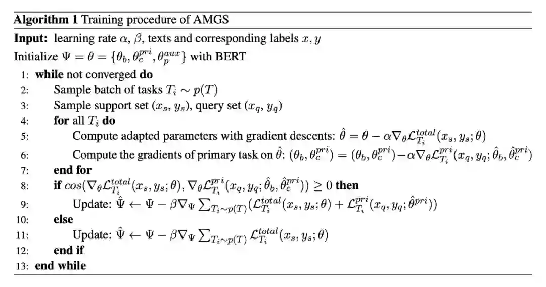 1. 本文基于两个不同的原则提出了一个基于优化的元学习方法 AMGS 并且设计了元训练算法来解决小样本文本分类任务的过拟合问题;