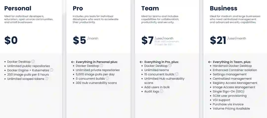2021 年,Docker 将产品订阅划分为个人、专业、团队和商业不同版本,其中个人版本免费,其主要面向社区,其他版本有不同程度的收费。同时,大型企业(定义为超过 250 名员工或年收入超过 1000 万美元)如果需要 Docker Desktop,必须使用付费订阅。