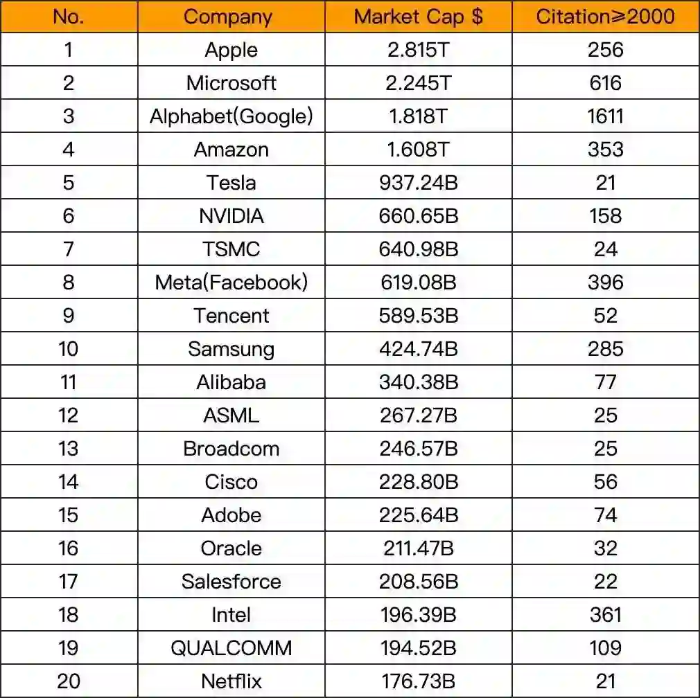 根据CompaniesMarketCap,我们列出了前20名科技公司的市值与Citation>=2000的人数关系。