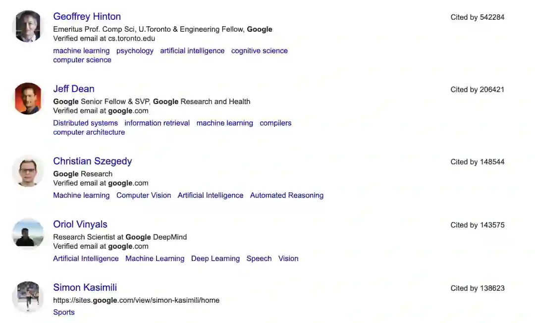谷歌1611名科学家居王座之首。在被引超过2000的前5名科学家中,就有一位大名鼎鼎的图灵奖得主Geoffrey Hinton,被引数高达542284。排在第二的便是谷歌大牛Jeff Dean,他的被引数为206421.