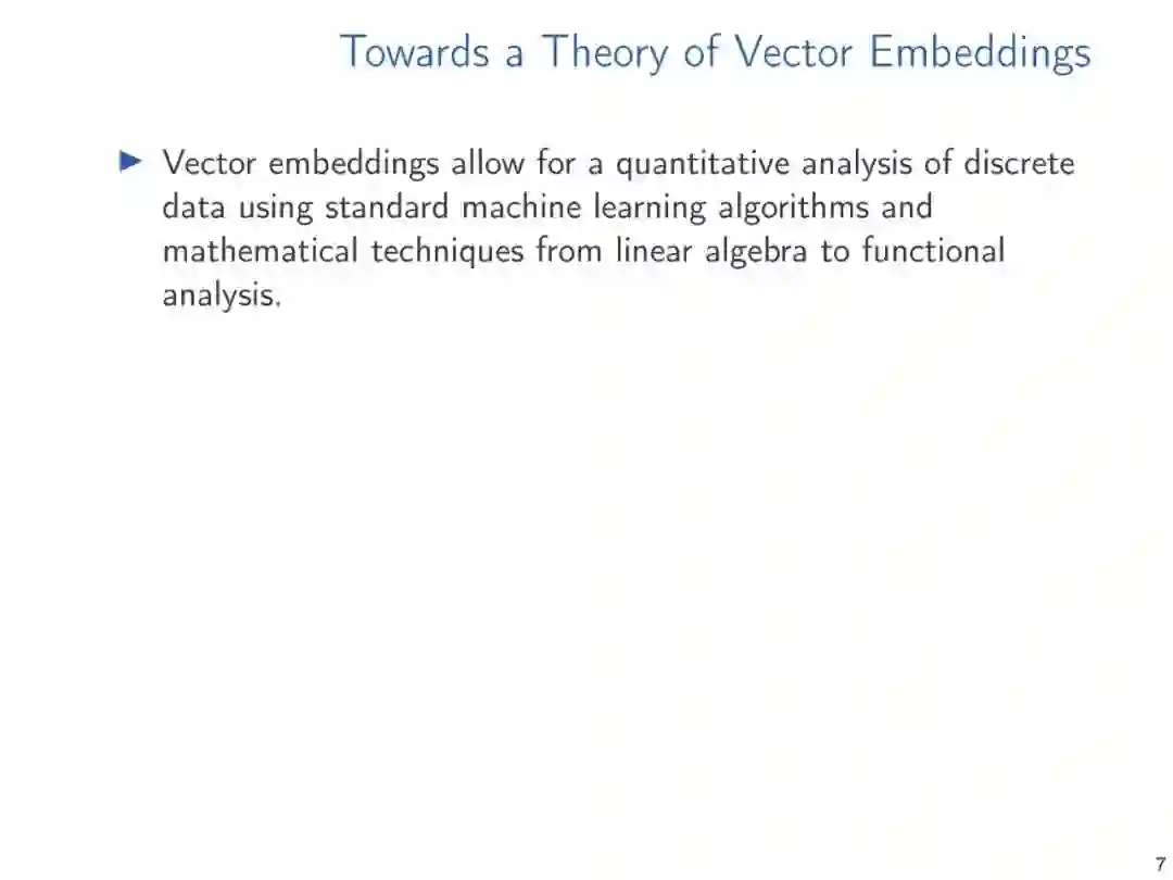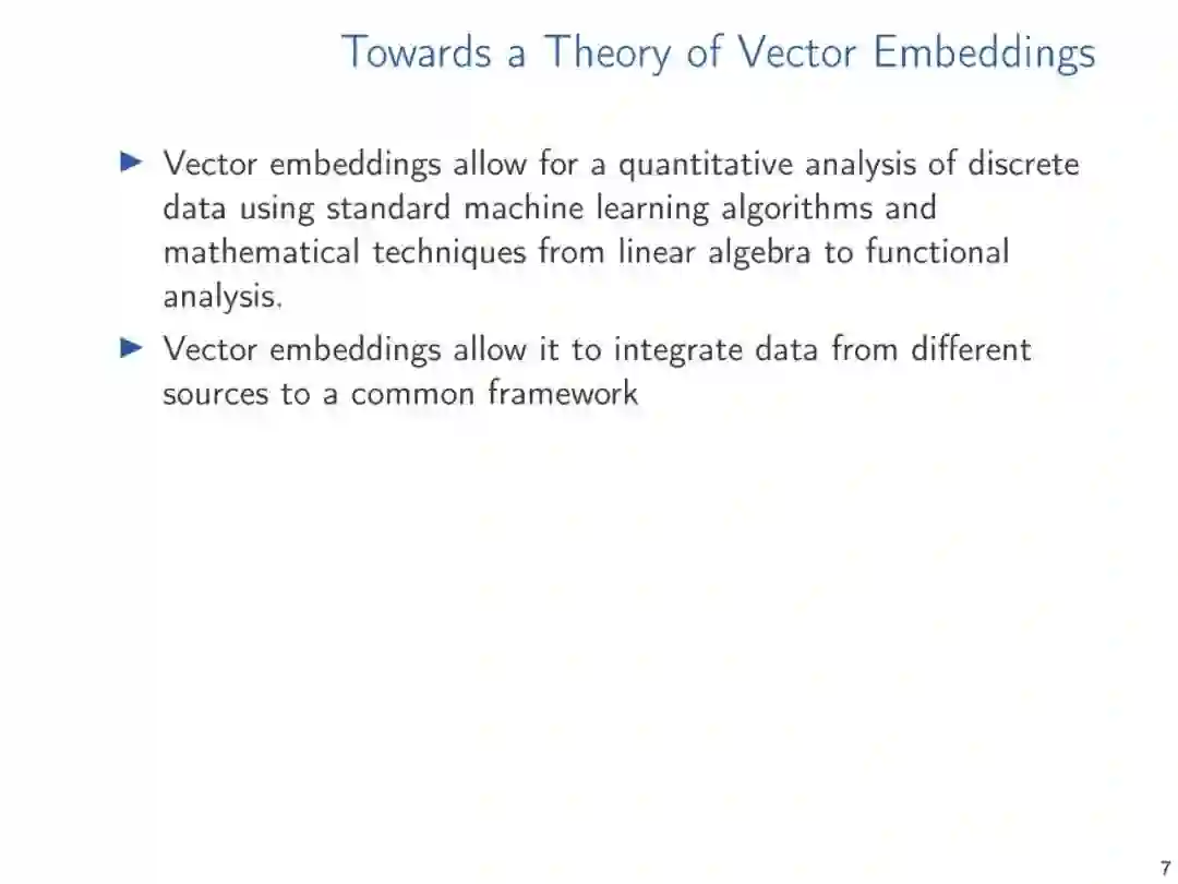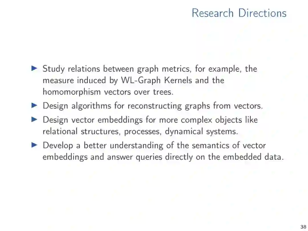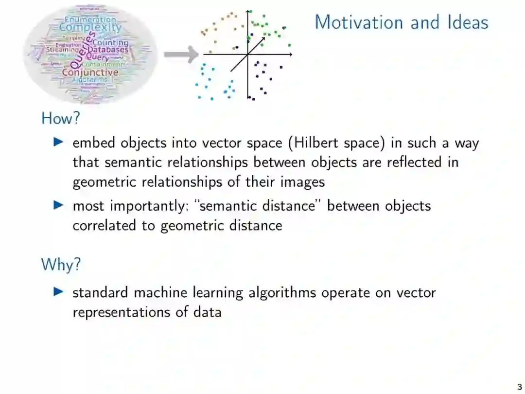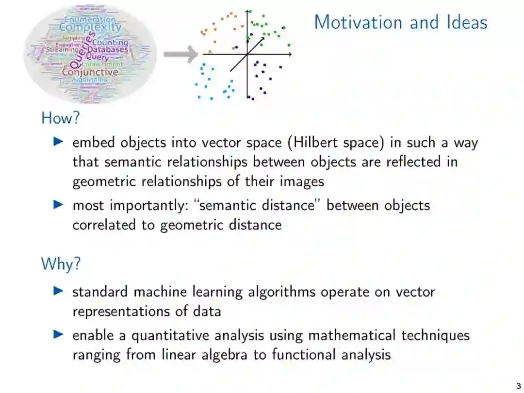 图和关系结构的向量表示,无论是手工制作的特征向量还是学习的表示,使我们能够将标准的数据分析和机器学习技术应用到结构中。在机器学习和知识表示文献中,广泛研究了产生这种嵌入的方法。然而,从理论的角度来看,向量嵌入得到的关注相对较少。从对已经在实践中使用的嵌入技术的调研开始,在这次演讲中,我们提出了两种理论方法,我们认为它们是理解向量嵌入基础的中心。我们将各种方法联系起来,并提出未来研究的方向。