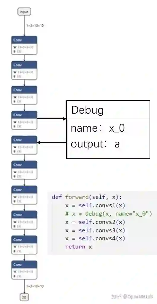 我们可以为原模型新写一个 forward 函数。在这个新的函数函数中,我们可以通过 debugger.debug 把每一个输出张量标记起来,并各取一个不重复的调试名。
