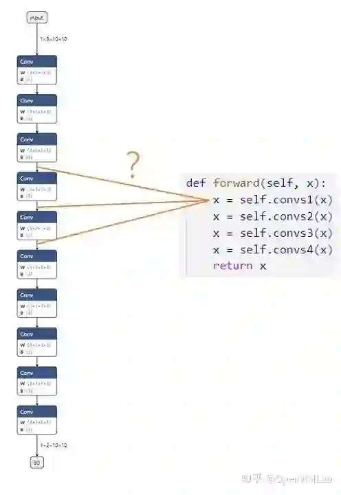 假设我们现在有一个由很多卷积块 convs1, convs2... 组成的网络,我们想对齐 PyTorch 模型和 ONNX 模型的精度。第一步,我们想比较第一个卷积块的输出 x = self.convs1(x)。模块在PyTorch 模型中的输出可以很轻松地得到,可是,这个输出究竟对应 ONNX 模型里的哪一个输出呢?在小模型里,我们或许能够通过阅读 PyTorch 模型的源码,推断出每个 ONNX 模块与 PyTorch 模块的对应关系;但是,在大模型中,我们是难以建立 PyTorch 与 ONNX 的对应关系的。