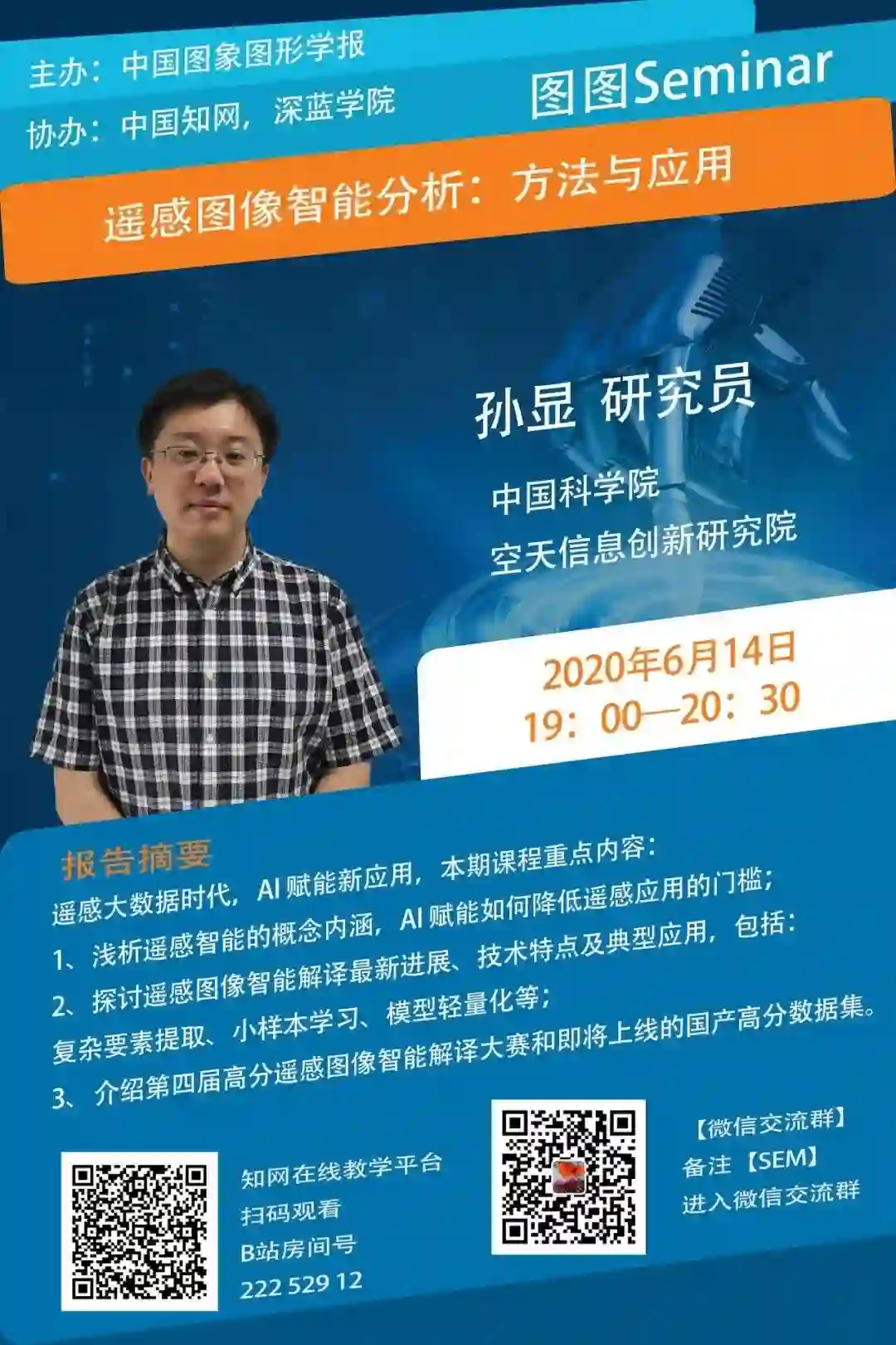 6月14日19:00-20:30,【图图Seminar】邀请中国科学院空天信息创新研究院孙显研究员,进行《遥感图像智能分析:方法与应用》的学术直播报告,欢迎图粉们添加编辑微信,提前进入【直播群】参与互动问答活动哦