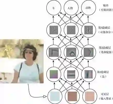 图 1.2 深度学习模型的示意图。计算机难以理解原始感观输入数据的含义,如表示为像素值集合的图像。将一组像素映射到对象标识的函数非常复杂。如果直接处理,学习或评估此映射似乎是不可能的。深度学习将所需的复杂映射分解为一系列嵌套的简单映射 (每个由模型的不同层描述) 来解决这一难题。输入展示在可见层,这样命名的原因是因为它包含我们能观察到的变量。然后是一系列从图像中提取越来越多抽象特征的隐藏层。因为它们的值不在数据中给出,所以将这些层称为“隐藏层”; 模型必须确定哪些概念有利于解释观察数据中的关系。这里的图像是每个隐藏单元表示的特征的可视化。给定像素,第 1 层可以轻易地通过比较相邻像素的亮度来识别边缘。有了第 1 隐藏层描述的边缘,第 2 隐藏层可以容易地搜索可识别为角和扩展轮廓的边集合。给定第 2 隐藏层中关于角和轮廓的图像描述,第 3 隐藏层可以找到轮廓和角的特定集合来检测特定对象的整个部分。最后,根据图像描述中包含的对象部分,可以识别图像中存在的对象 (经 Zeiler and Fergus (2014) 许可引用此图)